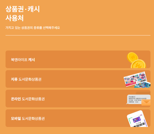 본인이 가지고 있는 상품권 종류가, 북앤라이프 캐시, 모바일 도서문화상품권, 온라인 도서문화상품권, 지류 도서문화상품권인지 먼저 파악을 하시고 아래에 도서문화상품권 사용처 이용방법을 숙지하시면 되겠습니다